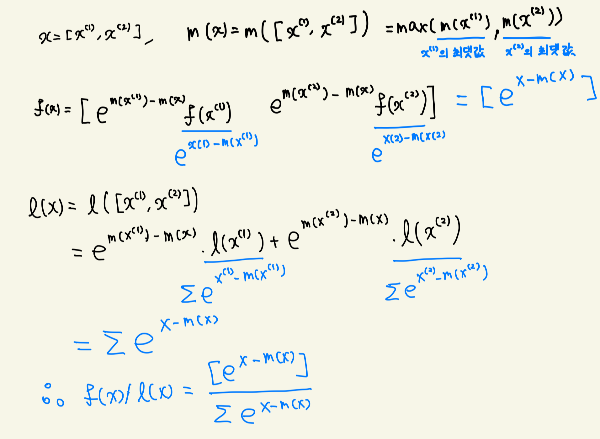 앞써 말한 Softmax 함수의 비효율성을 해결하기 위해 Flash Attention에서는 배열을 다음과 같이 분할하여 각각 softmax 함수를 적용하게 하여 필요한 메모리 공간을 효율적으로 줄일 수 있게 되었다.