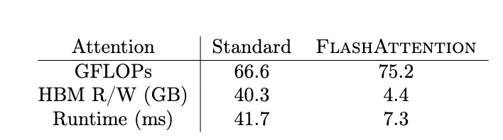 위의 기법을 통해 GFLOPs의 수는 늘어났지만 HBM에 대한 R/W가 획기적으로 줄면서 전체적인 학습과 추론 시간이 획기적으로 단축된 것을 볼 수 있다.