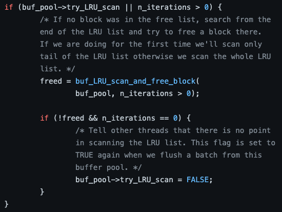 Victim page를 찾기 위해 Innodb가 실행 시키는 함수는 MySQL-server에서 buf0lru.cc에 있는 buf_LRU_get_free_block 함수 입니다.