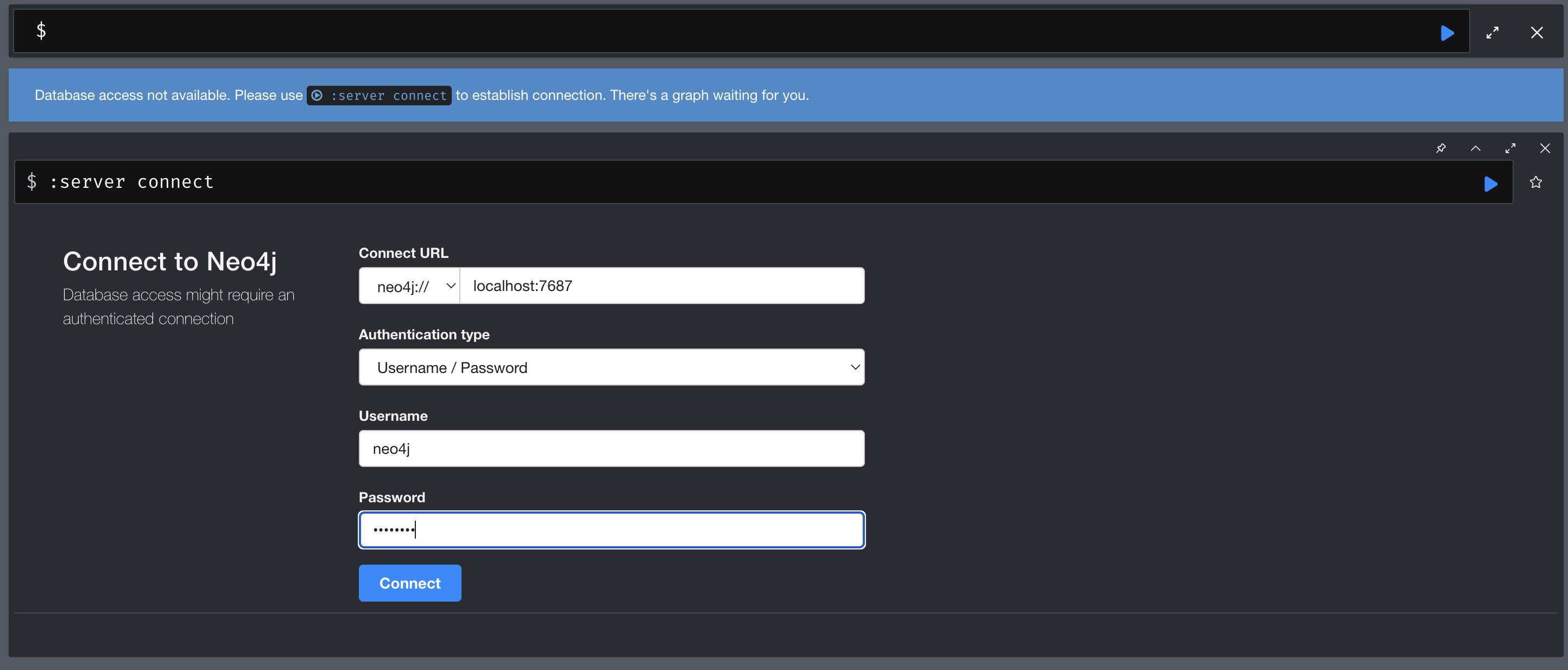 Neo4Jj인스턴스를 초기화 할때 사용하게 될 사용자 이름과 비밀번호를 설정하게 된다. 위와 같은 예시로 실행하게 되면
