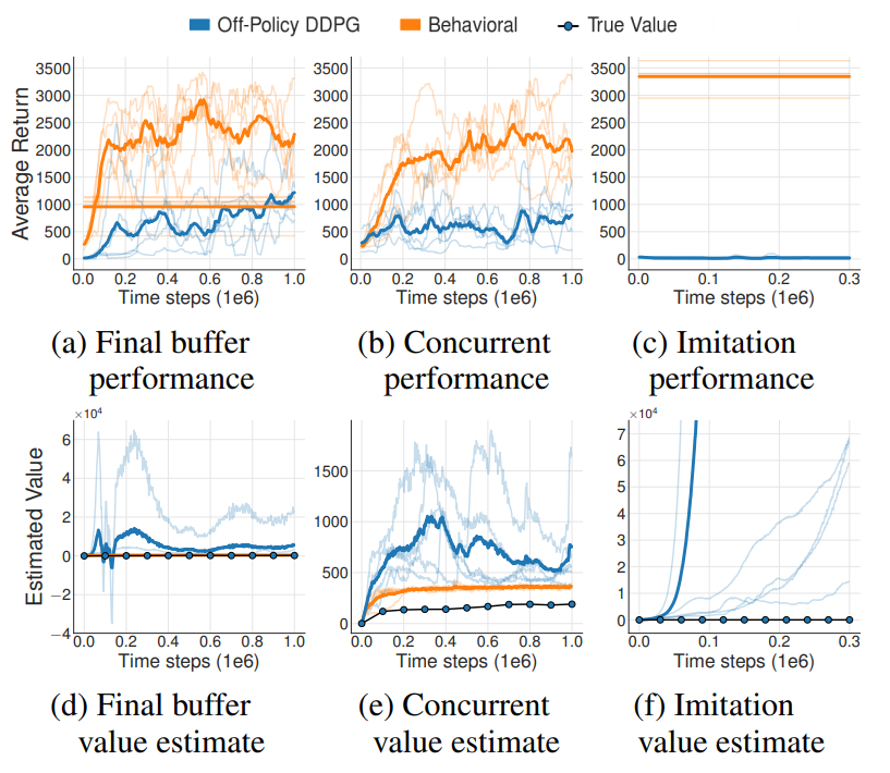 해당 실험에서는 주황색은 일반적인 DDPG알고리즘 이다. 파란색은 그에 반해 환경과 소통을 전혀 하지 않은 DDPG이다. (a)의 경우 주황색 agent가 학습 시 사용했던 마지막 버퍼를 가져와서 학습에 사용했던 것이고, (b)의 경우 주황색을 학습 시키면서 버퍼를 공유해서 파란색을 학습 시키는 것이다. 마지막으로 (c)의 경우 학습이 끝난 DDPG agent를 환경에서 실행을 시키면서 데이터를 얻은 것이다. (d), (e), (f)의 경우 각각 (a), (b), (c)의 경우에서 critic에 대한 결과를 나타낸 것이다. 학습 결과를 보시면 먼저 critic이 학습이 안 된 것을 알 수 있다. 이런 오류가 발생했는지에 대한 이유로 논문에서는 Extrapolation Error가 그 이유라고 이야기를 한다. 해당 Error는 버퍼에 파란색 에이전트가 뽑아낸 (s, a)에 대한 값이 없기 때문에 우리가 Q-learning을 진행 할때 학습이 제대로 안된다는 것이다.
