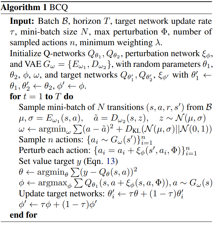 해당 알고리즘에서는 사용하는 Network는 총 7개이다. Clipped Double Q learning 을 사용하기 때문에 Q network가 2개와 Actor에 해당하는 Peturbation Network. 그리고 해당 알고리즘의 하이라이크 VAE이다. 또한 앞에서 말한 Q network와 Actor network를 soft learning을 하기 위해서 각각의 target network가 존재한다.