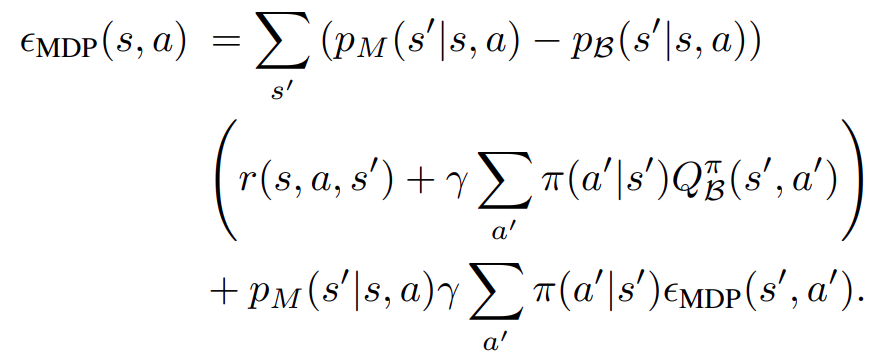 해당 수식을 전개해보면 다음과 같이 정리할 수 있는데요. 여기서 우리는 두가지를 알 수 있습니다. 우리가 만든 action을 이용한 (s, a, s')에 대한 상태천이함수가 우리가 목표로 하는 상황에서와 우리가 학습과정에서 사용하는 상황에서 같다면 그리고 전체 Trajectory에서 Extrapolation error가 0인 부분이 있다면 꼬리에 꼬리를 물어 전체 Trajectory에 대한 Extrapolation Error가 0이다 라고 이야기 할 수 있을 것입니다.