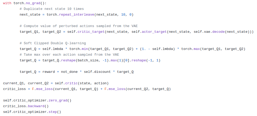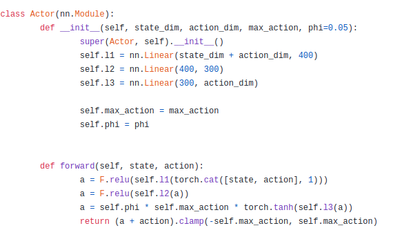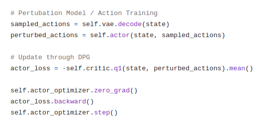 해당 Actor는 저자께서 말씀하신 RL trick을 위해서 사용하는 부분인 것 같다. 해당 forward 부분을 보면 값에 phi를 곱하고 이를 원래 action에 더하고 이를 clamping한 것을 볼 수 있다. 이는 앞써 VAE를 통해 뽑아낸 action에서 우리가 어느정도 boundary를 두고 action을 뽑아내여 우리가 원하는 optimal policy를 찾는 과정이라고 할 수 있다. 또한 해당 actor를 policy gradient를 업데이트를 함으로써 DPG와 같은 맥락으로 가져갈 수 있다.