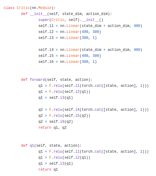 Q-network는 단순하다. 앞서 말했듯이 Double Q-network를 사용하기 때문에 foward 부분에서 우리는 q1과 q2가 나오는 것을 볼 수 있다. 이는 사실 Q에 대한 학습에서만 사용하기 위해서라 q1이라는 함수를 따로 만들어 우리가 action을 택할 때는 해당 q1만 사용하도록 하는 것을 볼 수 있다. 근데 사실 두개 다 똑같은 td-target을 두고 학습을 진행할 것이기 때문에 이렇게 하는 것 같다. 그게 아닌 다른 이유가 있다면 댓글로 알려주시면 감사드리겠습니다.