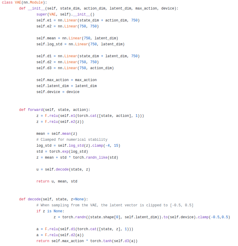 코드에서 알수 있다 싶이 encoding 부분은 state와 action을 받게 되서 latent dim에 맞는 z로 projection을 시킨다. 이때 VAE를 사용하는 만큼 z를 정규분포에서 sampling하는 것을 볼 수 있다.