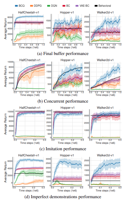 모든 경우 BCQ가 매우 잘하는 것을 볼 수 있다. 또한 앞에서 말한 부분에서 VAE만 사용하여 학습을 시켰을 때를 VAE-BC로 하여 RL-trick의 성능을 볼 수 있었는데 이는 (d)에서 두각을 나타냈다. 어쩌면 당연하지만 해당 buffer에서 optimal policy를 찾는 과정을 넣음으로써 아무 의미없는 것처럼 보이는 데이터에서 우리는 좋은 성능을 내는 agent를 학습 시킬 수 있는 것을 알 수 있다.
