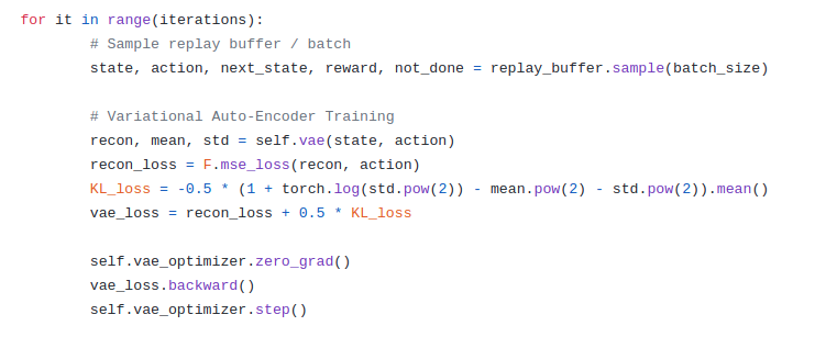 VAE는 reconstruction, 평균, 편차 를 만들어 낸다. 이 때 reconstruction 과 배치 상의 action과의 MSE를 통해 state가 들어갔을 때 데이터 분포에 있는 action을 뽑아내게 하는 것에 목적이 있다. 또한 앞서 말했듯이 중간 latent vector를 표준 정규분포에 근사시키기 위해 z에 대한 분포를 KL divergence를 통해 cosentration을 주게 된다.