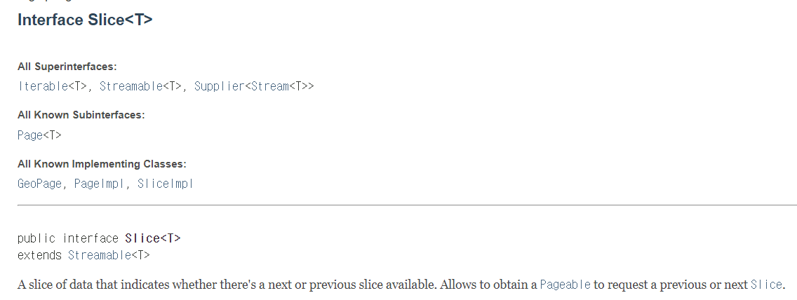 근데 중요한 점은 slice는 다음 혹은 이전 slice에 대한 정보만 가져올 수 있지만 page 인터페이스에 구현 목록에는 전체 page에 대한 조회가 있다. 이건 추후에 시험해 볼만 하겠지만 page로 만든 객체에 대한 jpa쿼리는 필요 이상으로 나갈 수 있을 것이라는 추측이 가능하다.
