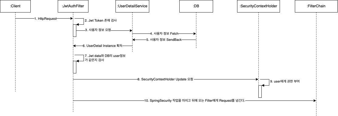 3~6. Jwt Token이 없다면 401 Forbidden을 반환하겠지만 있다면 UserDetailService를 호출하여 사용자의 정보를 검색한다. 이때 JwtAuthFilter가 받게되는 것은 UserDetail Instance로 추후 SecurityContextHolder에게 넘겨주게 된다.