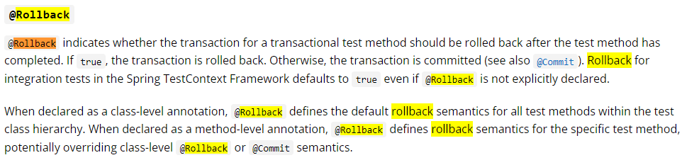 이와 같은 설명이 있다. 즉, 위의 어노테이션이 있다면 Transaction이 끝나고 commit을 하지 않고 rollback을 시킨다는 의미이다.
