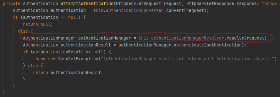 그럼 의문이 들 수 있다. 왜? 그냥 authenticationManager를 request마다 반환되게 만드는 부분을 추가했을까? 역시나 customising 부분 때문이라는 생각이 든다. 실제로도 검색 결과 request마다 authenticationManager를 선택할 수 있게 authenticationManagerResolver를 두었다는 설명을 찾을 수 있다.