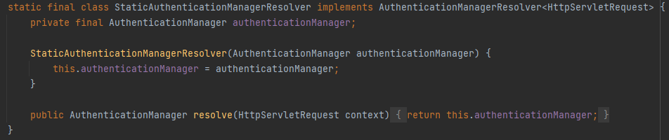 request를 가져와서 처리해주는 부분이 다시 존재하게 된다. 여기 부분을 공부 하면서 request를 가져왔으면 된거 아닌가 왜 또 request가 쓰이지? 라는 생각이 들었다. 하지만 이러한 AuthencticationManagerResolver가 implementation된 부분을 살펴 보면 request를 context로 지칭하고 이를 바탕으로 authenticationManager를 반환하는 것을 볼 수 있다.