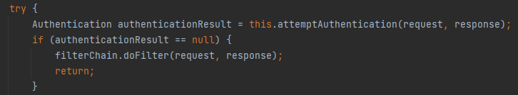 만약 request가 올바르다면 this.attemptAuthentication(request, response)부분이 적용이 된다.