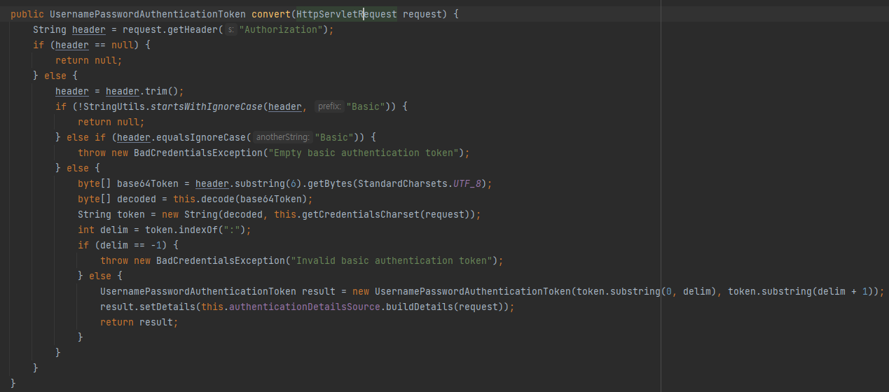 그럼 authenticationConverter는 무엇일까? 파악해본 결과 이는 다형성을 이용해서 AuthenticationConverter로 선언되어있다. 따라서 사용자가 이를 custom한 AuthenticationConverter로 이를 처리해줄 수 있는 부분으로 파악된다. 하지만 기본적으로 Spring에서 사용하는 authenticationConverter는 BasicAuthenticationConverter이다. 이러한 BasicAuthenticationConverter에서 convert해주는 부분에서 사용하는 인증 방식은 UsernamePasswordAuthenctication이다.
